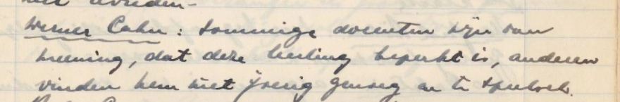 Uit de notulen van de lerarenvergadering blijkt dat de docenten niet zo tevreden zijn over Werner: [2] Sommige docenten zijn van mening dat deze leerling beperkt is, anderen vinden hem niet ijverig genoeg en te speels.