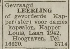 De kapsalon van vader Louis loopt goed. In maart 1942 heeft hij hulp nodig in zijn zaak. Er verschijnen advertenties in het Utrechts Nieuwsblad. O.a. deze:[5]