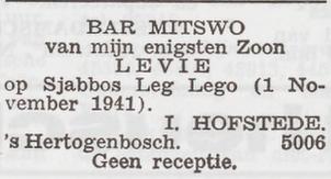 Daarin staat 'Levie Hofstede uit Den Bosch - moederloos' dat klopt want zijn moeder, Bertha Bouman, is op 16 juni 1941 overleden. [3]