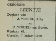 31 juli 1939 wordt ze opgenomen in het gezin van Jacob Weijel, dat op de Rijnlaan 66 woont. Jacob Weijel is huisarts. Grete maakt daar kennis met de pasgeboren baby van het echtpaar: Leentje. Op de Rijnlaan maakt ze de inval van de Duitsers mee. | |