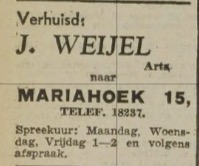 In 1941 mag Jacob Weijel alleen nog maar joodse patiënten behandelen. In april 1941 had hij nog 1698 ziekenfonds patiënten, een maand later nog maar vijf. Het gezin moet goedkoper gaan wonen.[3] Ze verhuizen in juni 1941 naar de Mariahoek 15. |