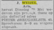 De joodse arts Weijel, die Grete in 1939 opnam in zijn gezin, overleeft wel de oorlog. Hij hervat op 26 mei 1945 zijn praktijk weer. |